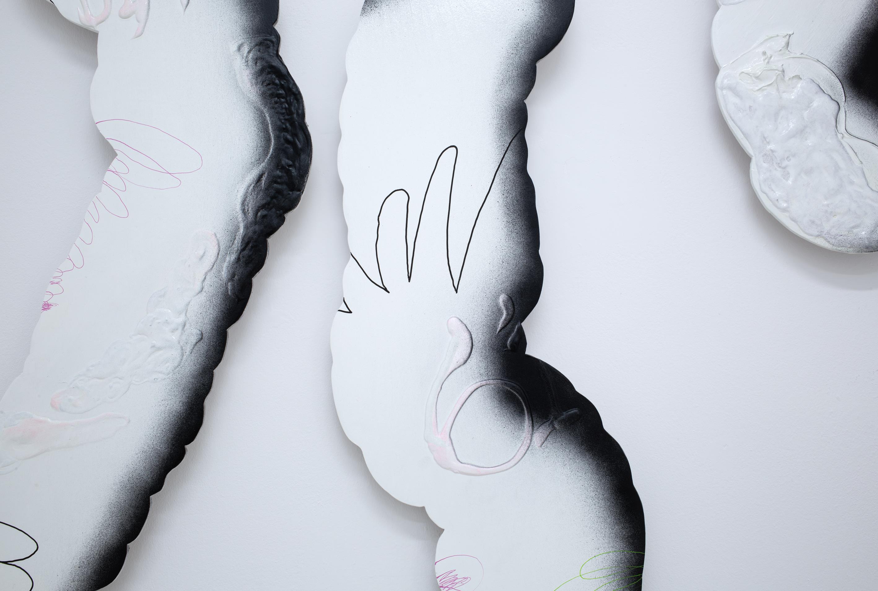 Marta Vovk odpowiada przeciążeniem. Jej prace migoczą jak wizualne załamania: memy, trauma, szminka, clickbait. Ile bólu można przetłumaczyć? Zakodowuje go w liczbach, językach, zakłóceniach. W jej kosmosie to, co prywatne, staje się bazą danych, a emocja interfejsem kontroli. W pracy Auf einer Skala von 1 bis 10 (W skali od 1 do 10) powierzchnia przechyla się w stronę organiczności: formy przypominające bakterie rozlewają się po płótnie, fragmenty pisma nakładają się na szkice gołębi pokoju i siatek ogrodzeniowych. Między rzeczywistościami wojny a dystopią wyłania się estetyka bakteriostatyczna – taka, w której ból już się nie goi, lecz zostaje zachowany.