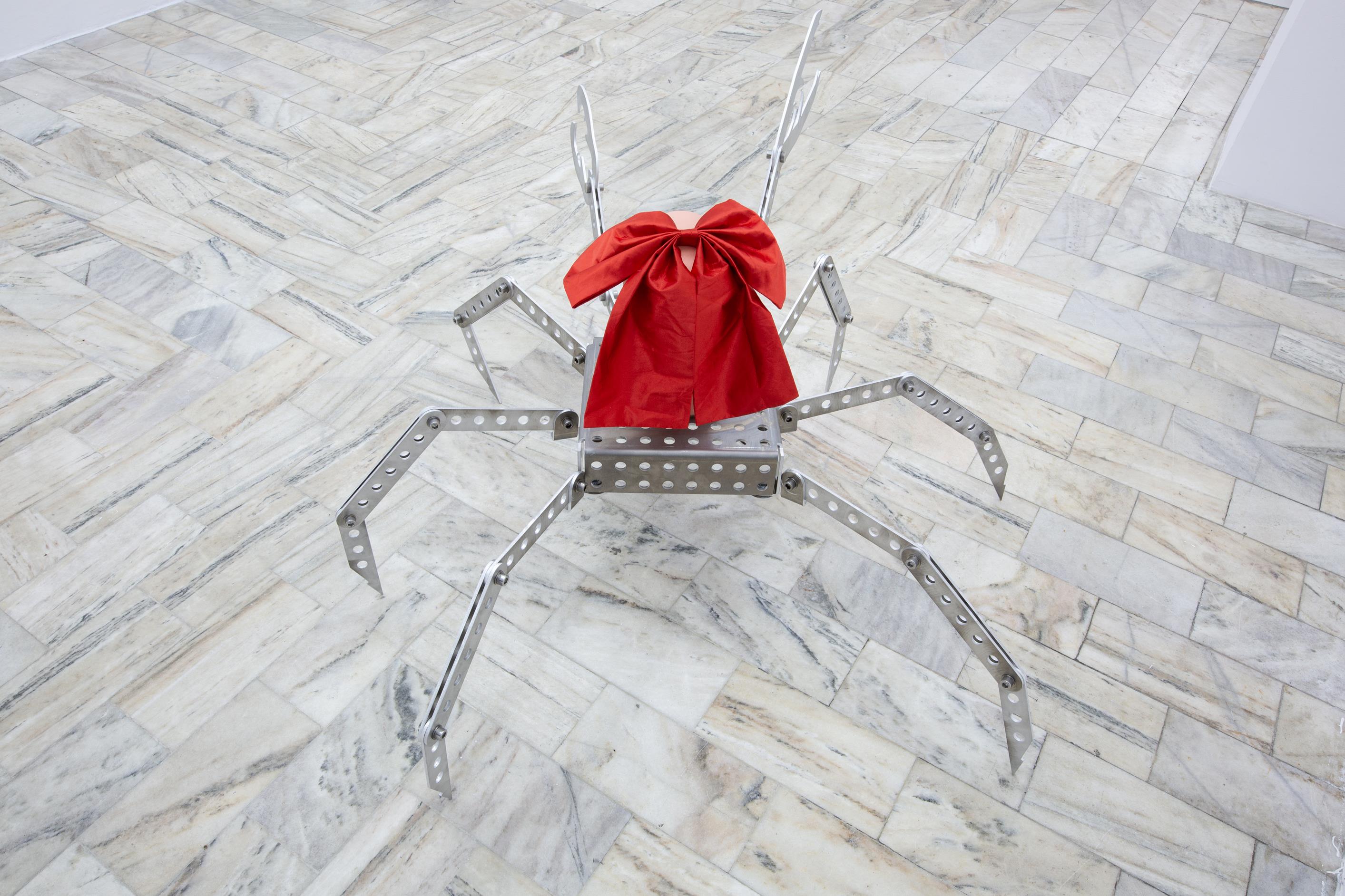 Alexander Scharf nadaje z tej strefy pogranicza. Jego rzeźba Spider Baby to mutacja historii konsumpcji: pół zabawka, pół demoniczna maskotka. Artefakt zrodzony z DNA Toy Story, złożony ze strachu i plastiku. Groza jako sprzężenie zwrotne nostalgii. W jego świecie cytat jest gestem i metodą: wydobywa figury z popkulturowego archiwum, przepuszcza je przez własny filtr i zwraca jako zniekształcone odbicia. Powtórzenie staje się algorytmem traumy. Jego system ścienny, oparty na Semiotic Standard of Alien, działa jak interfejs kontroli: język bez słów, który kieruje ruchem poprzez iluzję przejrzystości. To wizualne oprogramowanie posłuszeństwa – czyste, korporacyjne, cyberfaszystowskie. Groza jako porządek, precyzja, która zapomniała o empatii.